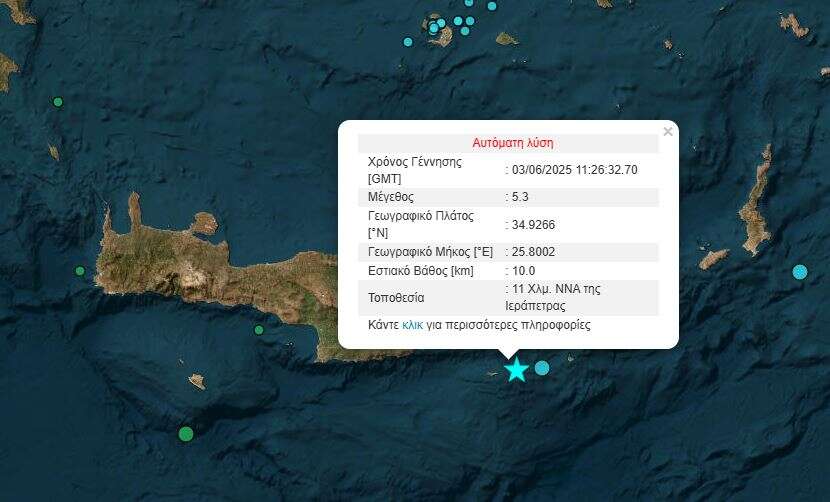 Ο σεισμός σύμφωνα με το Γεωδυναμικό Ινστιτούτο είχε εστιακό βάθος 9,2 χιλιόμετρα και το επίκεντρο είναι 14 χιλιόμετρα ανοικτά της Χρυσής Λασιθίου στην θάλασσα.