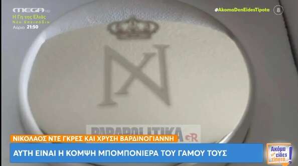 Τα «Παραπολιτικά» εξασφάλισαν φωτογραφία από την μπομπονιέρα του γάμου του Νικόλαου Ντε Γκρες με την Χρυσή Βαρδινογιάννη. Πρόκειται για μια δημιουργία από γυαλί Murano, με «χαραγμένα» τα αρχικά των ονομάτων των νεόνυμφων.