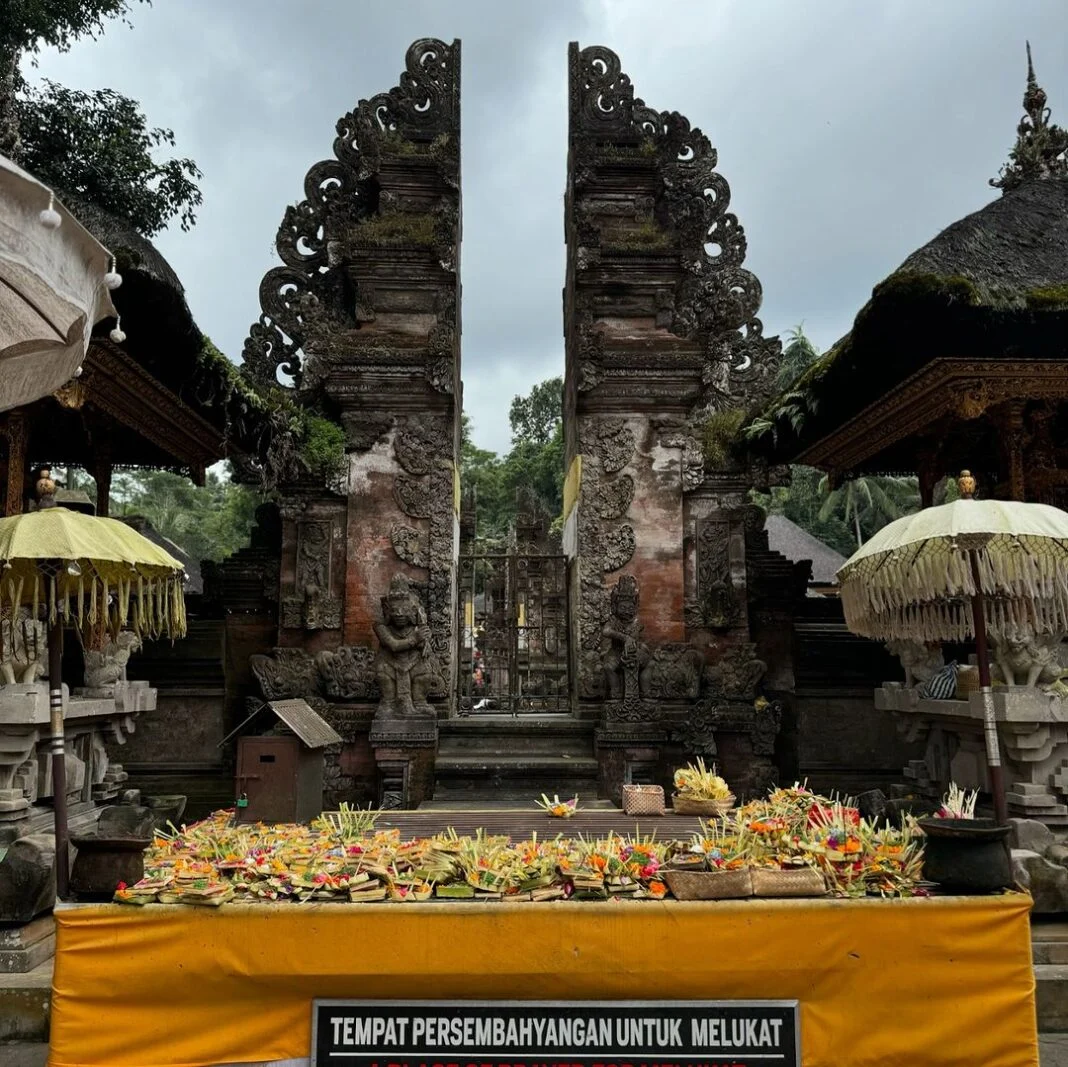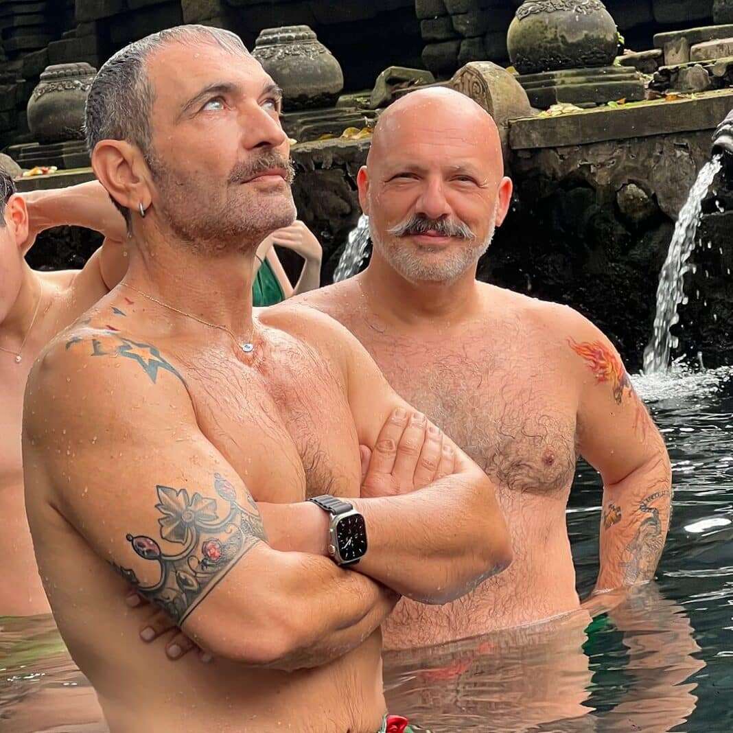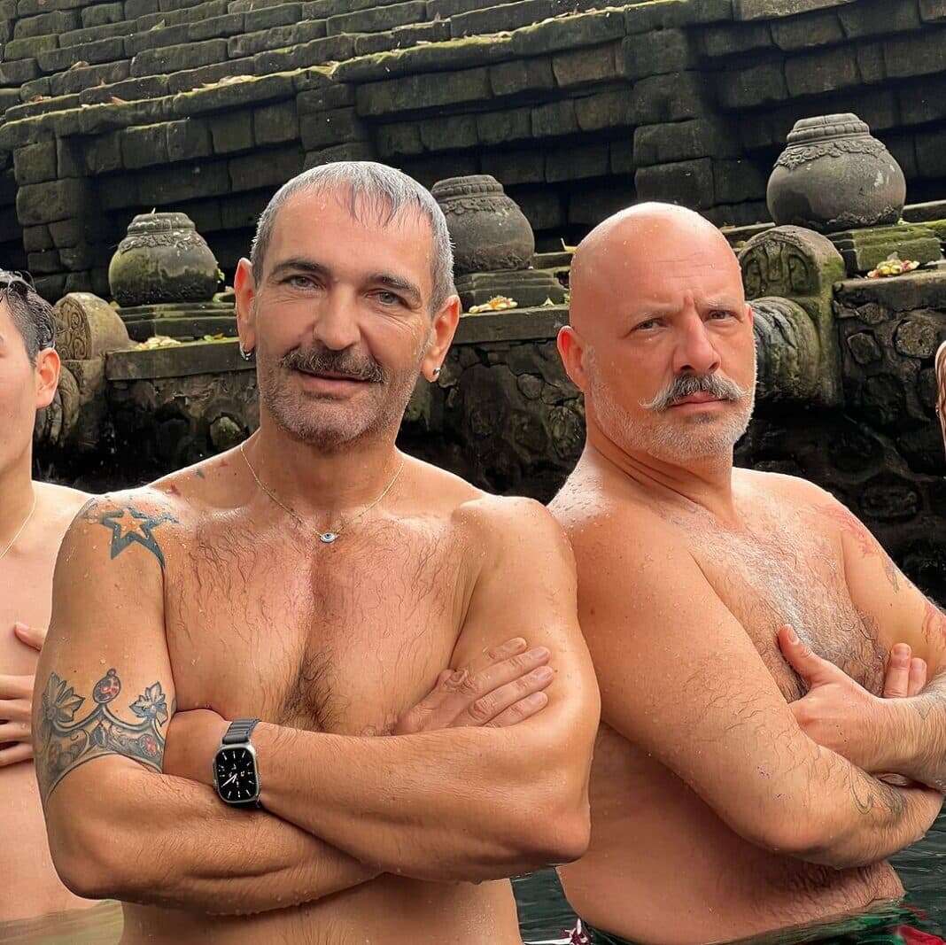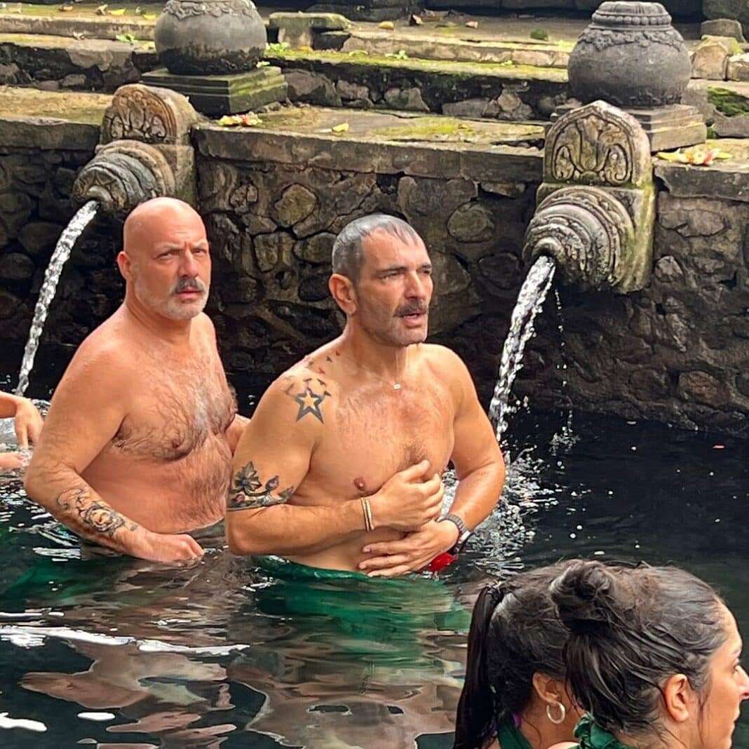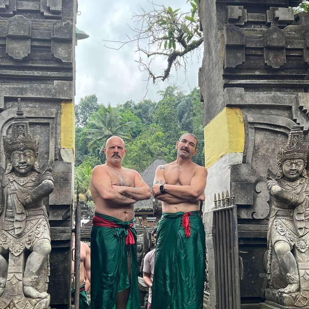 Ο Νίκος Μουτσινάς και ο Κωνσταντίνος Δέδες φόρεσαν την χαρακτηριστική πράσινη ενδυμασία στον Tirta Empul Holy Water Temple.