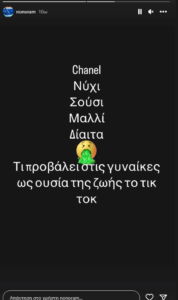 Η Ελεονώρα Μελέτη έγραψε στα Instagram Stories της: «Chanel, νύχι, σούσι, μαλλί, δίαιτα. Τι προβάλλει στις γυναίκες ως ουσία ζωής το TikTok».