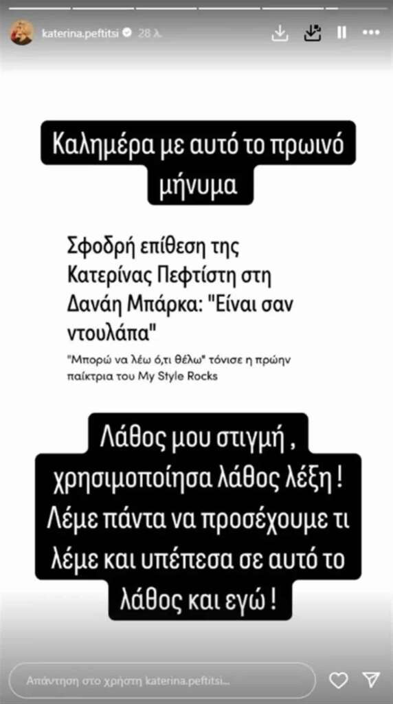 Μόλις η Κατερίνα Πεφτίτση είδε ότι η δήλωση που έκανε άρχισε να αναπαράγεται στο διαδίκτυο και σε ιστοσελίδες, θέλησε να απολογηθεί και να ζητήσει δημόσια συγγνώμη.