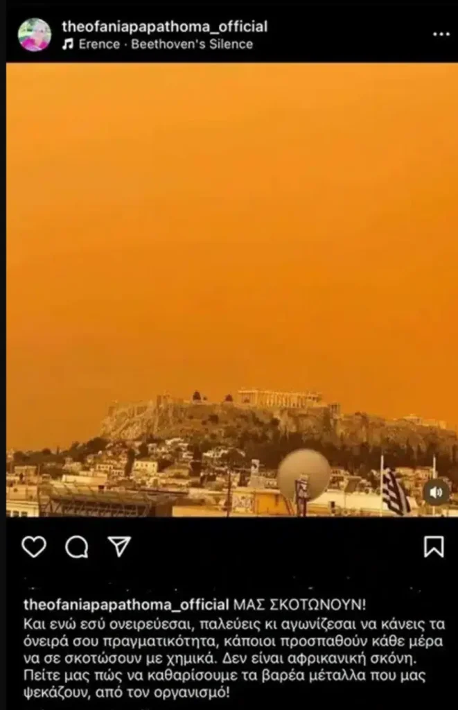 Η Θεοφανία Παπαθωμά έκανε μια ανάρτηση με την οποία αμφισβητεί την προέλευση του πέπλου σκόνης που κάλυψε σχεδόν όλη την Ελλάδα τις προηγούμενες ώρες.