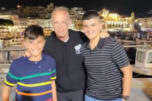 Μάλιστα, ο Τομ Χανκς δεν δίστασε να φωτογραφηθεί και με τα δύο εγγόνια του δημάρχου Καρπάθου, Γιάννη Νισύριου, σύμφωνα με την τοπική ιστοσελίδα karpathiakanea.gr.
