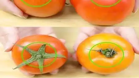 Μίσχος: Οι φυσικά ώριμες ντομάτες έχουν συνήθως μια ομοιόμορφη κόκκινη απόχρωση που εκτείνεται μέχρι το στέλεχος. Οι χημικά επεξεργασμένες ντομάτες έχουν συχνά ένα πρασινωπό ή ανοιχτόχρωμο κομμάτι γύρω από τον μίσχο επειδή η διαδικασία ωρίμανσης δεν είναι ομοιόμορφη.