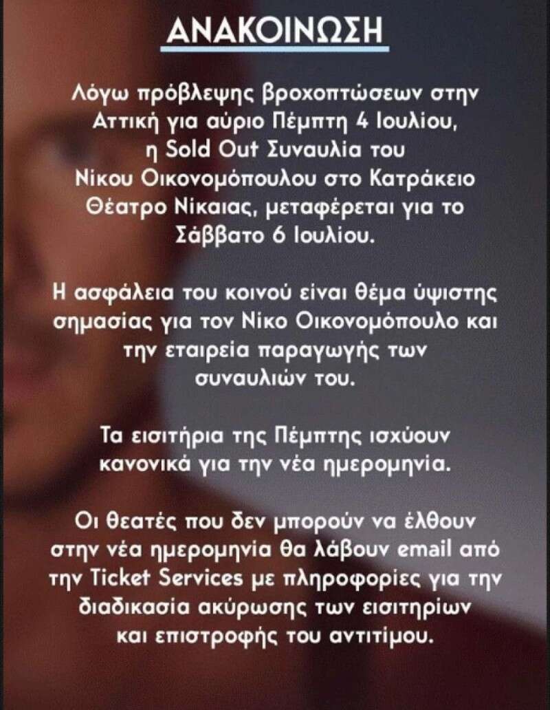 «Λόγω πρόβλεψης βροχοπτώσεων στην Αττική για αύριο Πέμπτη 4 Ιουλίου η sold out συναυλία του Νίκου Οικονομόπουλου στο Κατράκειο Θέατρο Νίκαιας μεταφέρεται για το Σάββατο 6 Ιουλίου.