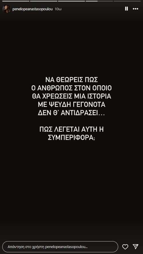 Ειδικότερα, μέσα από τον προσωπικό της λογαριασμό στο Instagram, η Πηνελόπη Αναστασοπούλου δημοσίευσε μια ιστορία στην οποία και υπογραμμίζει τα εξής, «Να θεωρείς ότι ο άνθρωπος στον οποίο θα χρεώσεις μια ιστορία με ψευδή γεγονότα, δε θα αντιδράσει».