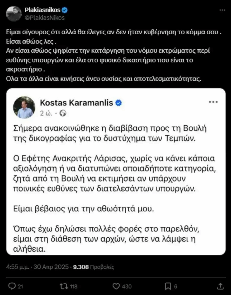 Μετά την ανάρτηση του Κώστα Καραμανλή, κατά την οποία ανέφερε πως είναι διαθέσιμος στις αρχές, αναφορικά με την διαβίβαση της δικογραφίας για την τραγωδία των Τεμπών που θα διερευνήσει ποινικές του ευθύνες, ο Νίκος Πλακιάς που έχασε τις κόρες του και την ανιψιά του στο σιδηροδρομικό δυστύχημα, του απάντησε στα social media.