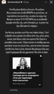 Με στόρι της στο Instagram, η κ. Τσαμπάζη που έχασε το 2022 τον σύντροφό της Αλέξανδρο Νικολαΐδη, ξεκαθαρίζει όσα όφειλαν να είναι αυτονόητα, ωστόσο στην χώρα μας παραμένουν αντικείμενο χυδαίας κριτικής ακόμα και από ιερωμένους που υποτίθεται ότι κηρύττουν τον λόγο της αγάπης.