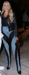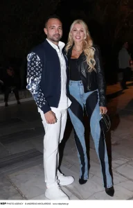 Το 700 ευρώ skinny jean της Κωνσταντίνας Σπυροπούλου με το μαύρο τούλι και το Louis Vuitton τζάκετ του Σταθοκωστόπουλου.