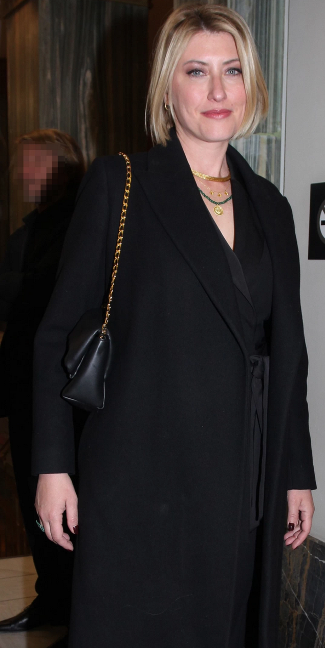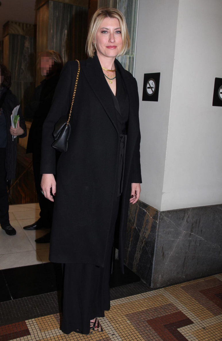 Η σύζυγος του Κώστα Μπακογιάννη και παρουσιάστρια του κεντρικού δελτίου ειδήσεων του ΣΚΑΪ επέλεξε ένα total black σετ και παλτό το οποίο συνδύασε με ιδιαίτερες γόβες με διάφανες ρίγες.