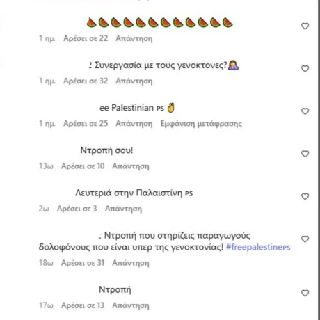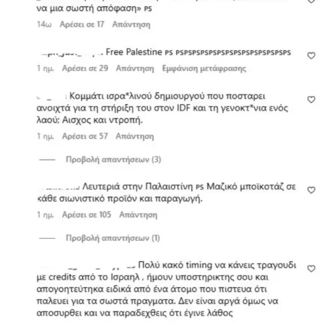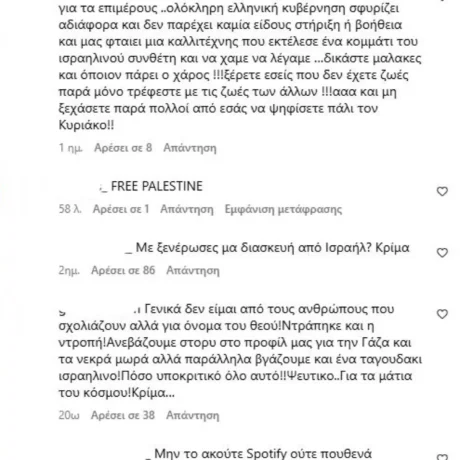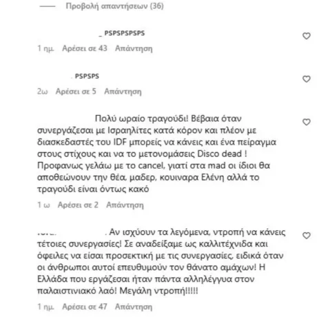 Κάτω από την ανάρτηση που έχει κάνει στον προσωπικό της λογαριασμό στο Instagram για το τραγούδι της, οι διαδικτυακοί της φίλοι την έχουν «ξεσκίσει» με πολλούς να αναρωτιούνται «Γιατί συνεργαζόμαστε με Ισραηλινούς εν έτη 2025 Ελένη? Ντράπηκε και η ντροπή».