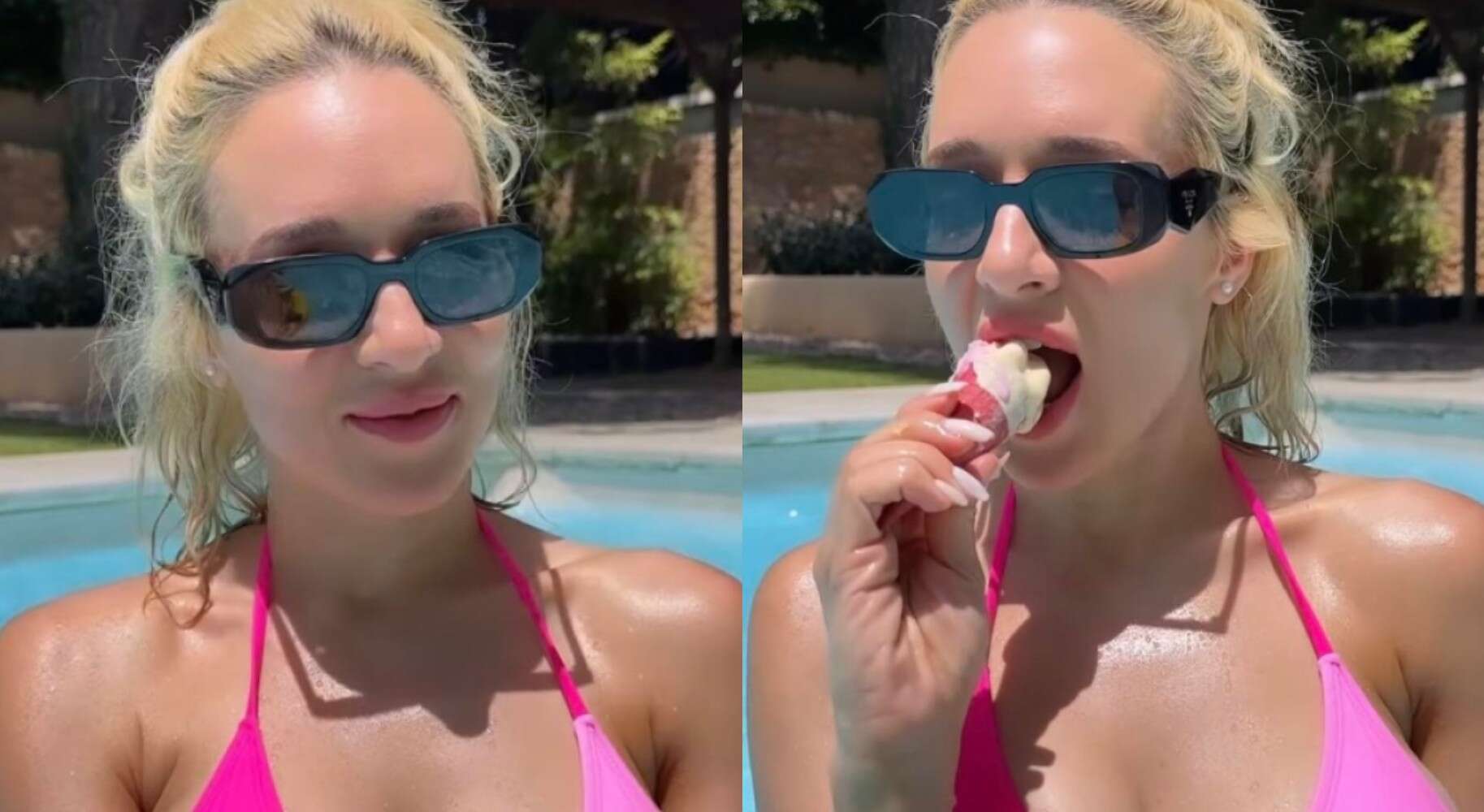 Φορώντας ένα φουξ μπικίνι και γυαλιά ηλίου, η Καλομοίρα γύρισε ένα μικρό κλιπ μέσα από το νερό, για να πει στους διαδικτυακούς της φίλους τι απολαμβάνει το καλοκαίρι.