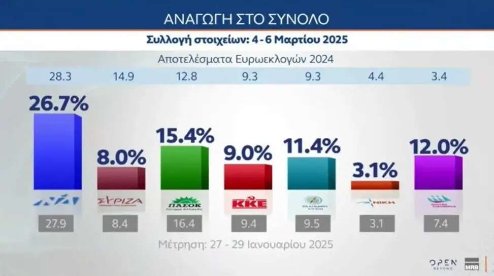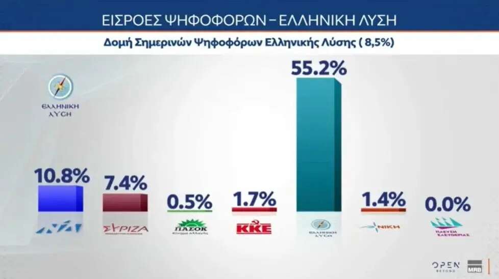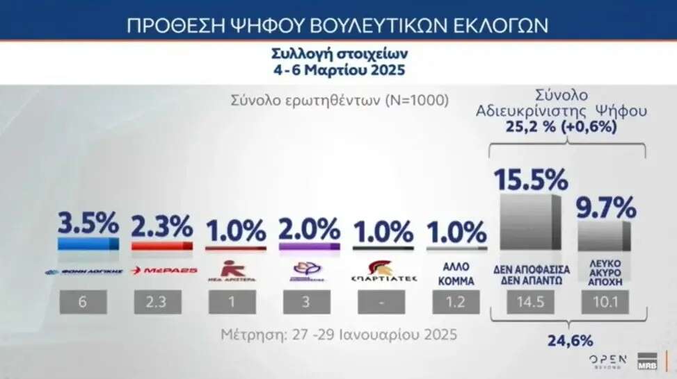 Ειδικότερα, σύμφωνα με τη δημοσκόπηση της MRB, για λογαριασμό του Open, στην πρόθεση ψήφου η ΝΔ είναι στο 20%, το ΠΑΣΟΚ στο 11,5%, η Πλεύση Ελευθερίας στην τρίτη θέση με 9%, η Ελληνική Λύση 8,5%, το ΚΚΕ 6,7%, ο ΣΥΡΙΖΑ 6%, ενώ το σύνολο της αδιευκρίνιστης ψήφου είναι στο 25,2%.