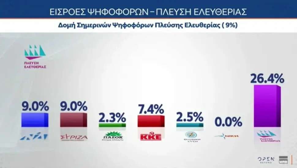 Αναφορικά με τις εισροές προς το κόμμα της Πλεύσης Ελευθερίας, το 9% προέρχεται από ΝΔ, το 9% από ΣΥΡΙΖΑ, το 2,3% από ΠΑΣΟΚ, το 7,4% από ΚΚΕ, το 2,5% από Ελληνική Λύση.