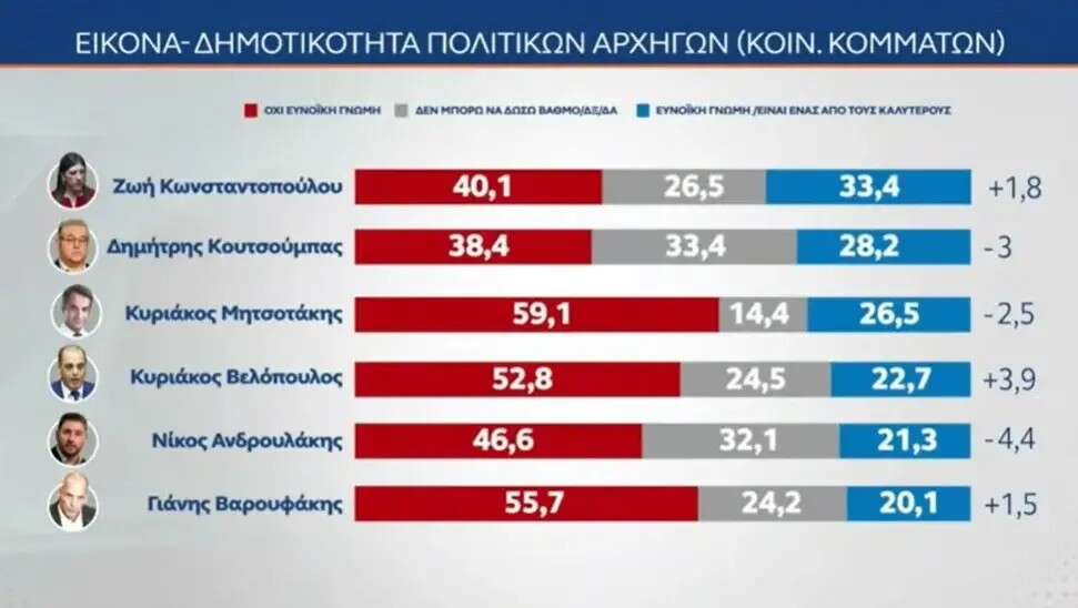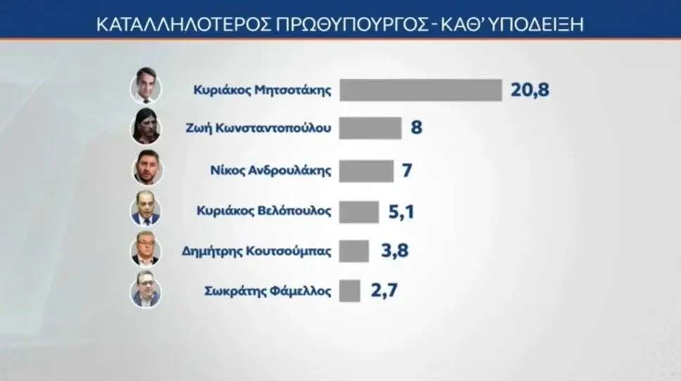 Στην καταλληλότητα για την πρωθυπουργία, ο Κ. Μητσοτάκης λαμβάνει 20,8%, η Ζ. Κωνσταντοπούλου 8%, ο Ν. Ανδρουλάκης 7% και ο «Κανένας» 36.7%.