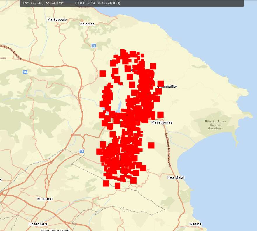 Ο καπνός από τη φωτιά στην Αττική έχει φτάσει στη Σπάρτη – Το μέγεθος της φωτιάς αποτυπώνεται στις δορυφορικές εικόνες της NASA, με τις διάσπαρτες εστίες να φαίνονται στον χάρτη