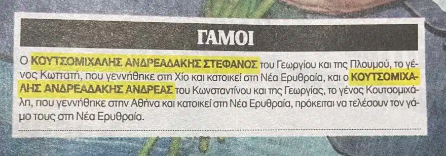 Η Espresso έφερε στη δημοσιότητα και την αναγγελία του γάμου τους που γράφει: «Ο Κουτσομιχάλης Ανδρεαδάκης Στέφανος του Γεωργίου και της Πλουμού, το γένος Κωττατή, που γεννήθηκε στη Χίο και κατοικεί στη Νέα Ερυθραία, και ο Κουτσομιχάλης Ανδρεαδάκης Ανδρέας του Κωνσταντίνου και της Γεωργίας, το γένος Κουτσομιχάλη, που γεννήθηκε στην Αθήνα και κατοικεί στη Νέα Ερυθραία, πρόκειται να τελέσουν τον γάμο τους στη Νέα Ερυθραία».