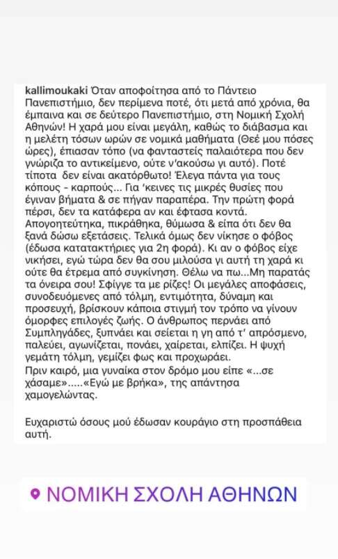 Στην ανάρτησή της είπε ακριβώς: «Όταν αποφοίτησα από το Πάντειο Πανεπιστήμιο, δεν περίμενα ποτέ, ότι μετά από χρόνια, θα έμπαινα και σε δεύτερο Πανεπιστήμιο, στη Νομική Σχολή Αθηνών! Η χαρά μου είναι μεγάλη, καθώς το διάβασμα και η μελέτη τόσων ωρών σε νομικά μαθήματα (Θεέ μου πόσες ώρες), έπιασαν τόπο (να φανταστείς παλαιότερα που δεν γνώριζα το αντικείμενο, ούτε ν’ακούσω γι αυτό). Ποτέ τίποτα δεν είναι ακατόρθωτο! Έλεγα πάντα για τους κόπους – καρπούς…”