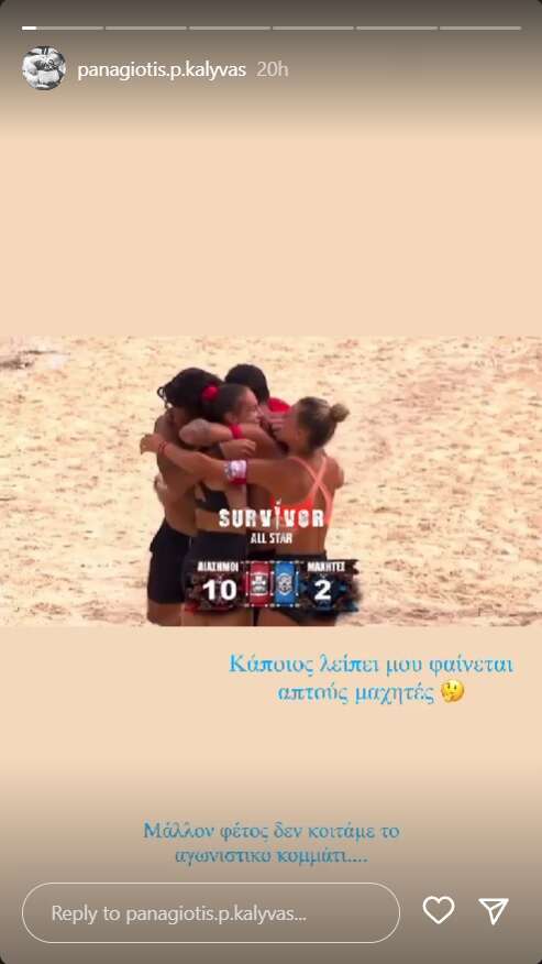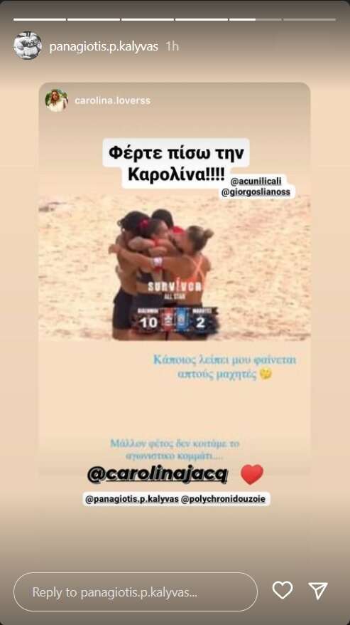 «Η Καρολίνα πιστεύω πέτυχε πάρα πολλά με τη συμμετοχή της στο Survivor, για τον χαρακτήρα της και το μέλλον της. Το είδε αγωνιστικά το θέμα του Survivor. Εγώ πιστεύω ότι δεν ήξερε που πάει, έτσι όπως εξελίχθηκε το παιχνίδι, αλλά πιστεύω πέρασε τέλεια» είπε για το Survivor και την αποχώρηση της.