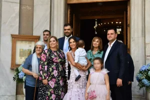 Ο κυβερνητικός εκπρόσωπος και η σύζυγός του υποδέχτηκαν στο πλευρό τους αγαπημένους συγγενείς και φίλους. Ο μικρός τους πήρε το όνομα Δημήτρης.