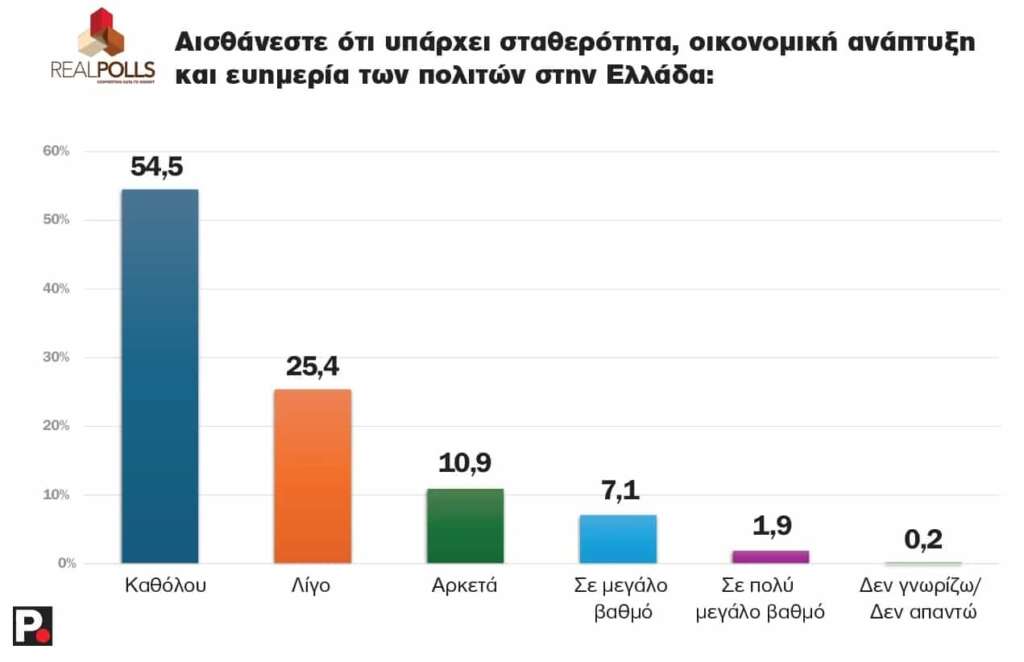 Οι πολίτες αισθάνονται ότι η χώρα δεν κινείται προς τη σωστή κατεύθυνση και ότι οι πολιτικές και κοινωνικές συνθήκες δεν βελτιώνονται. Χαρακτηριστικό είναι ότι στο ερώτημα: «Αισθάνεστε ότι υπάρχει σταθερότητα, οικονομική ανάπτυξη και ευημερία των πολιτών στην Ελλάδα;», που αποτελεί και το κυρίαρχο αφήγημα της κυβέρνησης, γύρω στο 80% των πολιτών απαντούν «Καθόλου» και «Λίγο».