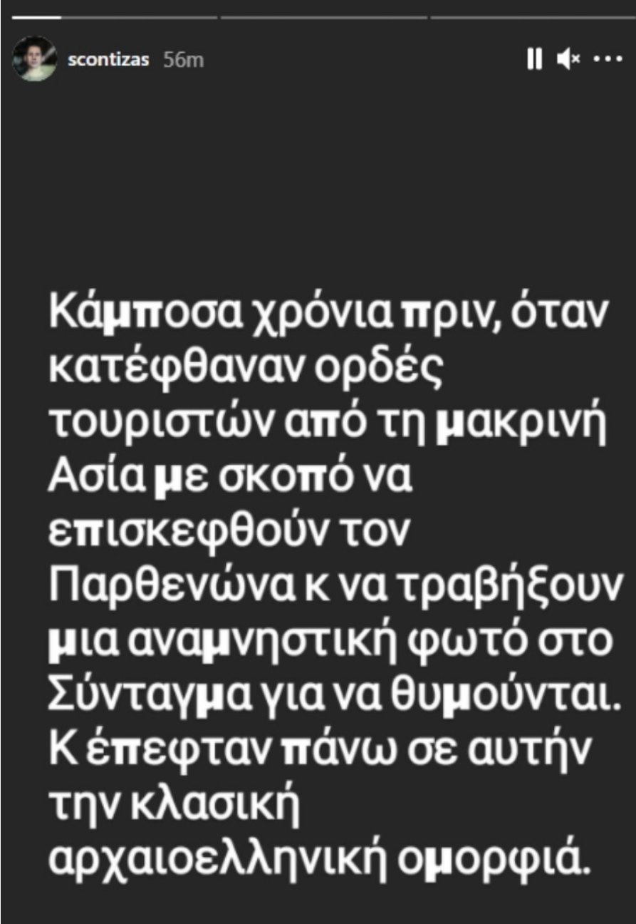 «Κάμποσα χρόνια πριν, όταν κατέφθαναν ορδές τουριστών από τη μακρινή Ασία με σκοπό να επισκεφθούν τον Παρθενώνα κ να τραβήξουν μια αναμνηστική φωτό στο Σύνταγμα για να θυμούνται. Κ έπεφταν πάνω σε αυτήν την κλασική αρχαιοελληνική ομορφιά», έγραψε ο Σωτήρης Κοντιζάς στο Instagram αστειευόμενος σχετικά με την εμφάνισή του.