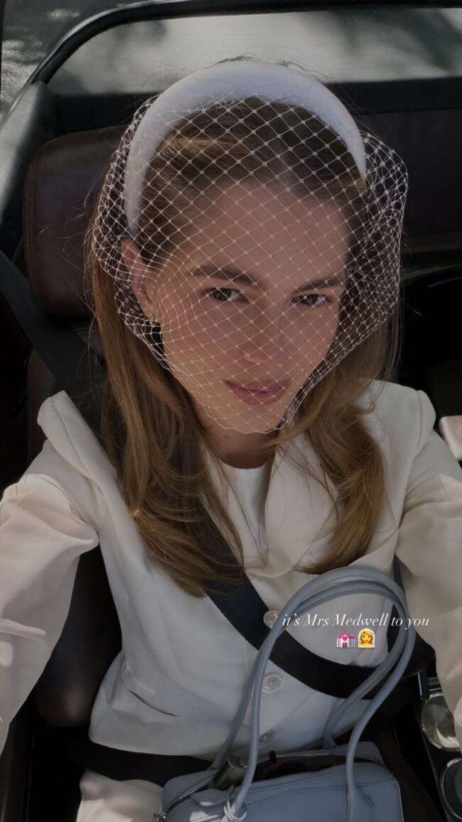 Η νύφη ανέβασε μια φωτογραφία. Στην φωτογραφία εμφανίζεται με νυφικό βέλο και κοστούμι με λεζάντα Its Mrs Medwell to you (Κυρία Μέντγουελ για εσάς).