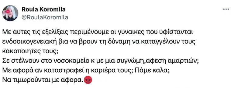 «Με αυτές τις εξελίξεις περιμένουμε οι γυναίκες που υφίστανται ενδοοικογενειακή βία να βρουν τη δύναμη να καταγγέλλουν τους ακακοποίητες τους; Σε στέλνουν στο νοσοκομείο κ με μια συγγνώμη, άφεση αμαρτιών; Με αφορά αν καταστραφεί η καριέρα τους; Πάμε καλά; Να τιμωρούνται με αφορά», έγραψε χαρακτηριστικά η παρουσιάστρια.