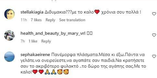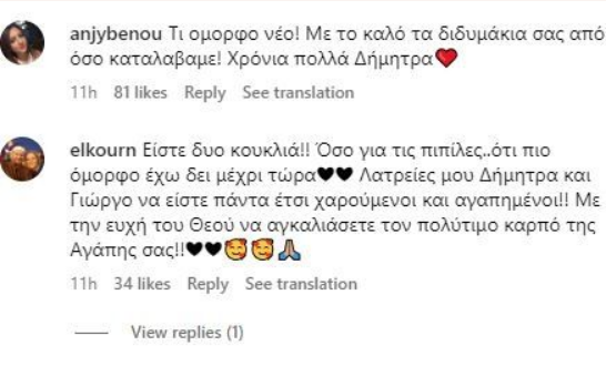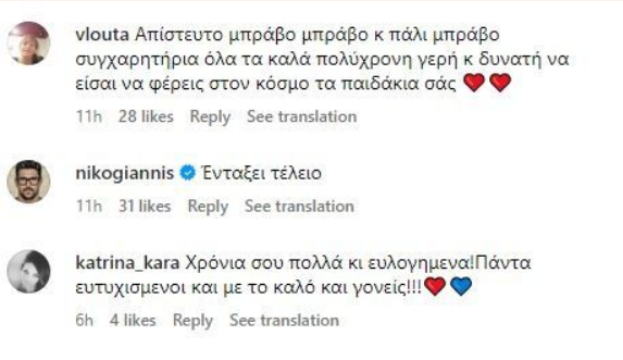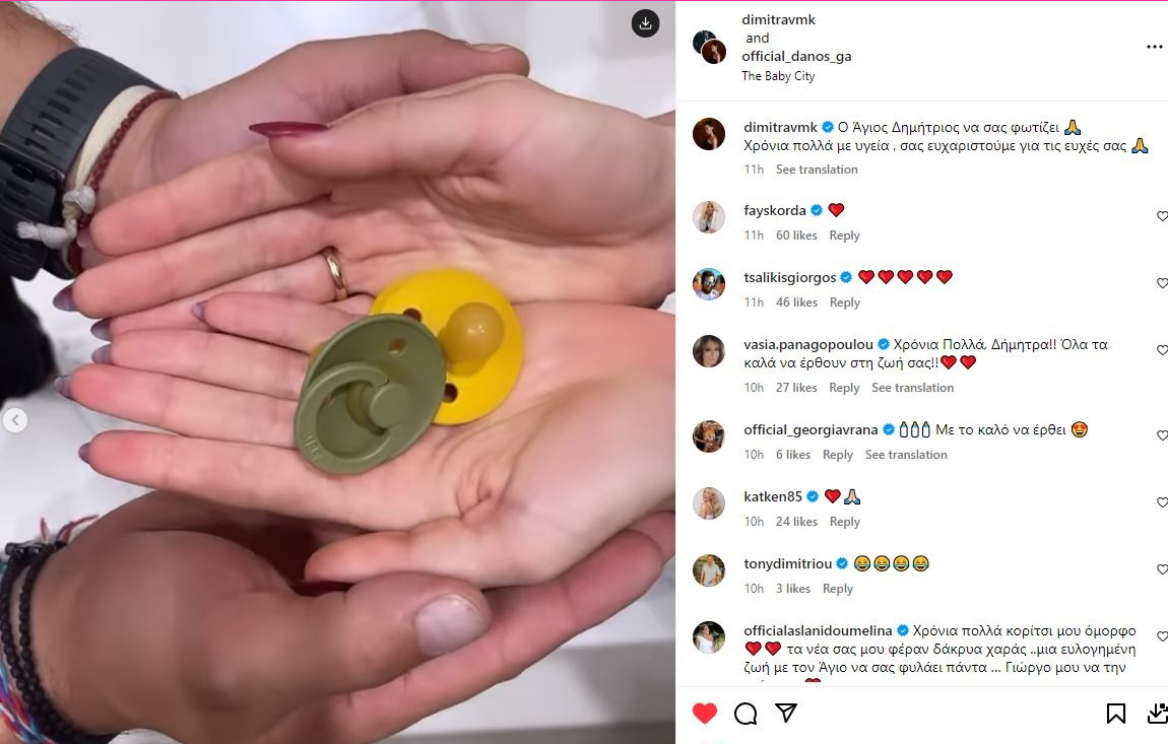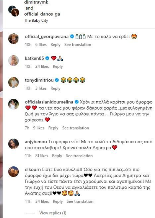 Μόλις έκαναν τη συγκεκριμένη ανάρτηση αμέσως οι celebrities άρχισαν να τους εύχονται “Με το καλό”. Ανάμεσά τους η Κατερίνα Καινούργιου, η Φαίη Σκορδά, η Βάσια Παναγοπούλου η οποία συνεργάζεται με τον Ντάνο στη Γη της Ελιάς, ο Γιώργος Τσαλίκης και η Μελίνα Ασλανίδου.