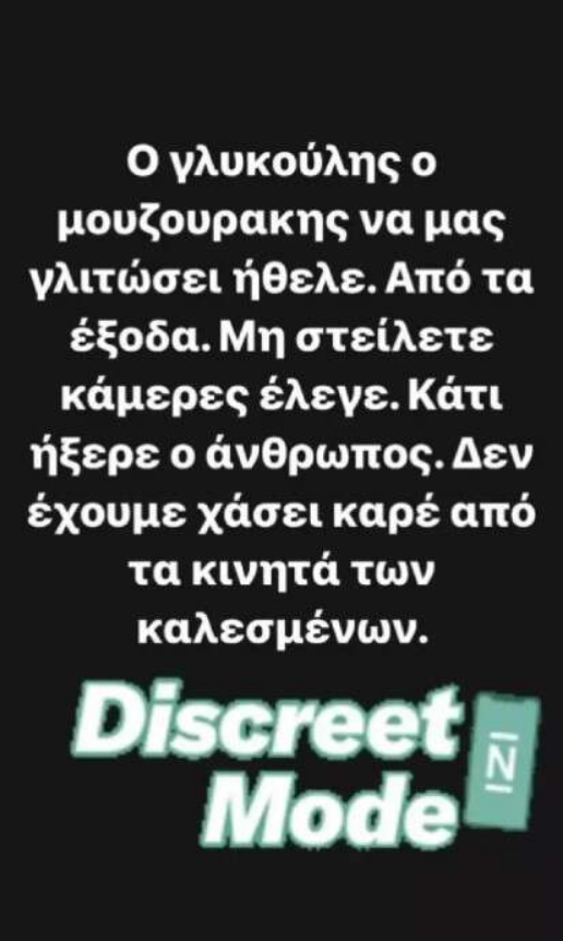 «Ο γλυκούλης ο Μουζουράκης να μας γλιτώσει ήθελε. Από τα έξοδα. Μη στείλετε κάμερες έλεγε. Κάτι ήξερε ο άνθρωπος. Δεν έχουμε χάσει καρέ από το κινητά των καλεσμένων».