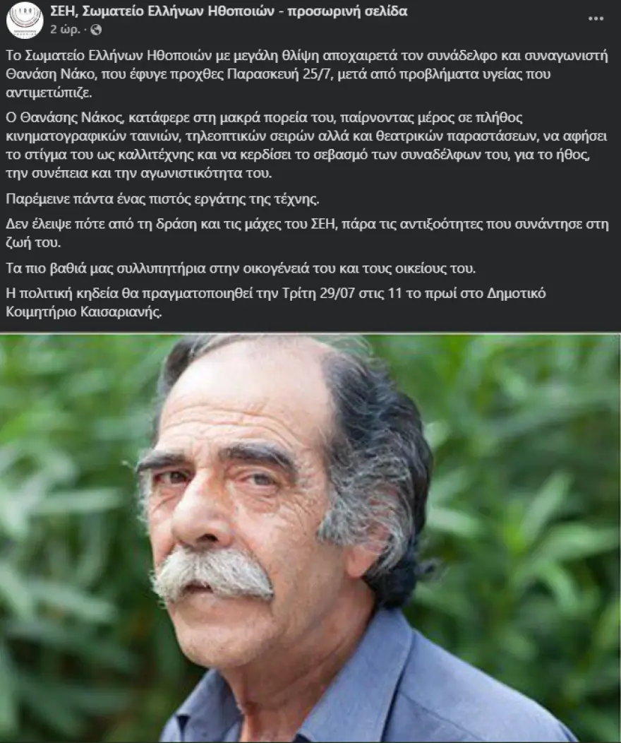Έφυγε από τη ζωή σε ηλικία 79 ετών ο Θανάσης Νάκος την Παρασκευή 25 Ιουλίου, έπειτα από προβλήματα υγείας που αντιμετώπιζε. Τη δυσάρεστη είδηση έκανε γνωστή το Σωματείο Ελλήνων Ηθοποιών με ανάρτησή του στον επίσημο λογαριασμό του στο Facebook.
