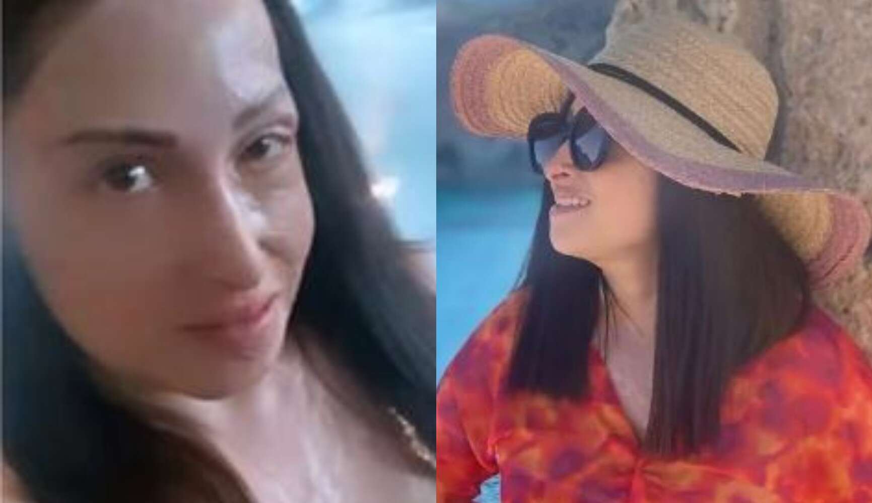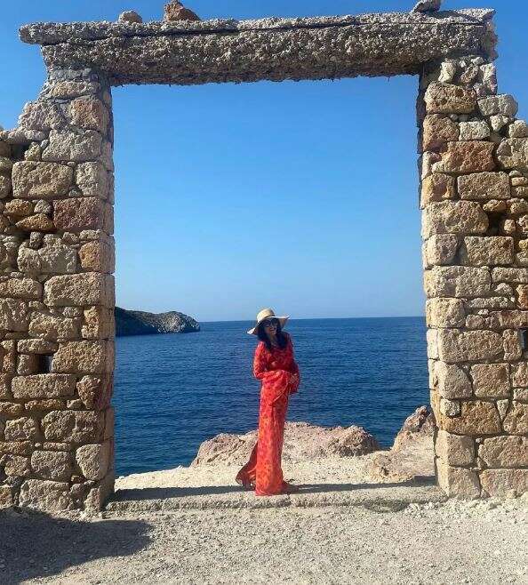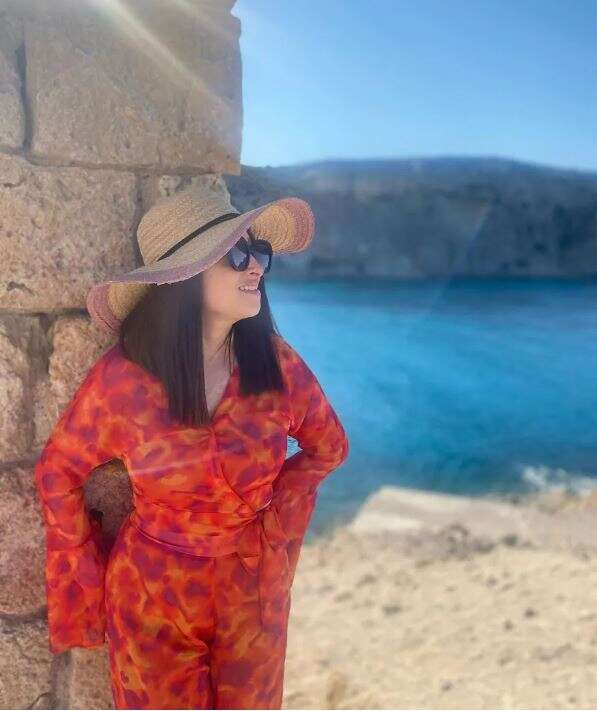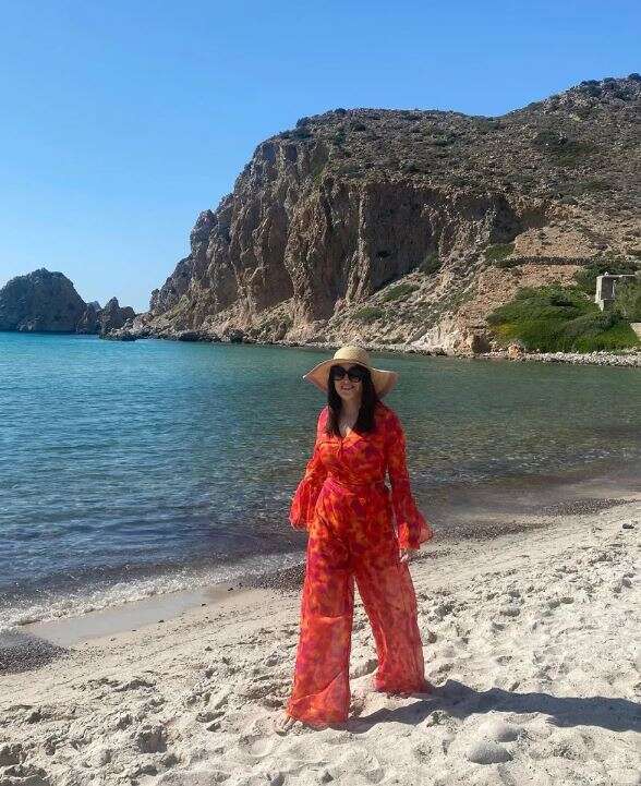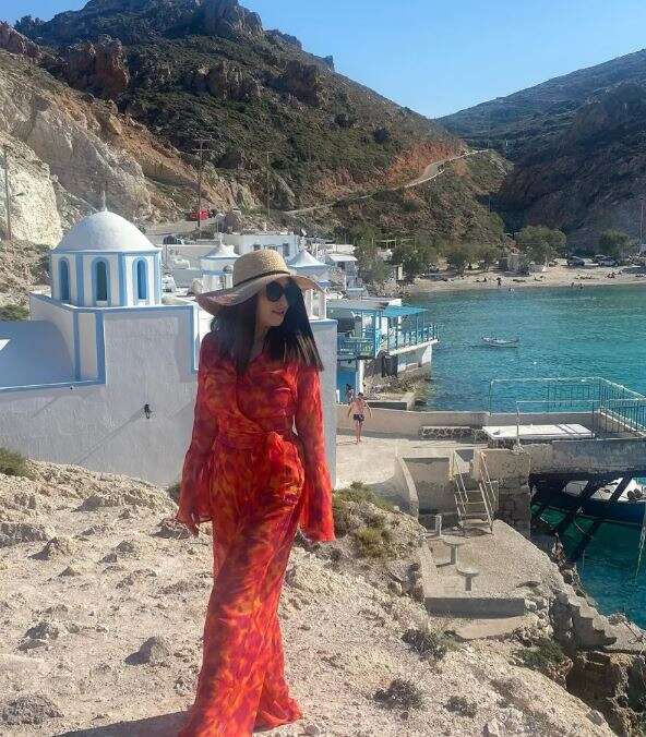 Στις φωτογραφίες εμφανίζεται η ίδια να φορά μία ολόσωμη παντελόνα στα χρώματα του κόκκινου και του πορτοκαλί, ένα καπέλο και γυαλιά ηλίου, την ώρα που παίρνει διάφορες πόζες με φόντο την παραλία του νησιού.