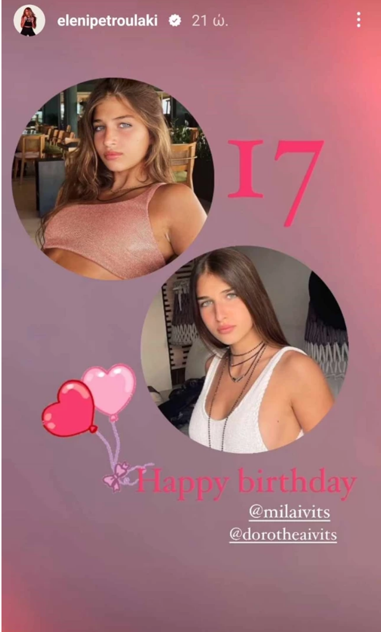 Η Ελένη Πετρουλάκη δημοσίευσε ένα insta story με τα πρόσωπα των δύο κοριτσιών της, Μίλα και Δωροθέα και τις όμορφες ευχές της. Μάλιστα όπως βλέπουμε, οι δύο δίδυμες αδερφές, μοιάζουν όχι μόνο στα χαρακτηριστικά αλλά έχουν και τα ίδια χρώματα. Έχουν ανοιχτόχρωμα μάτια και καστανά μαλλιά.