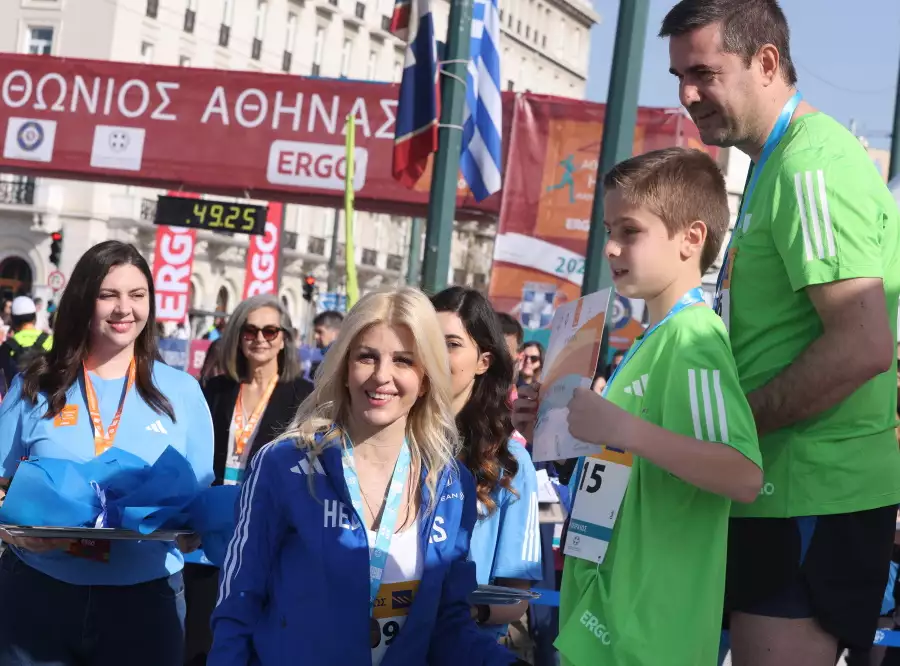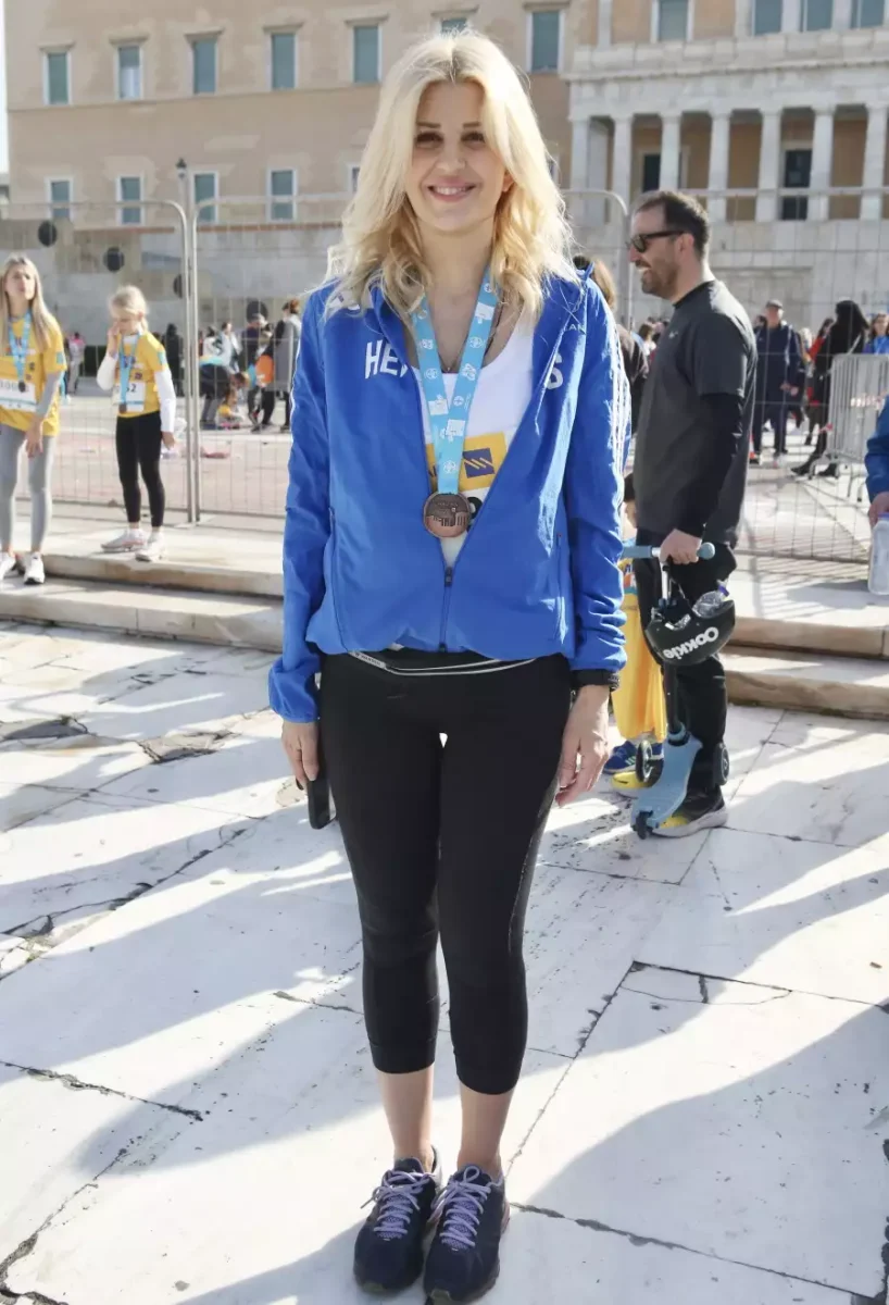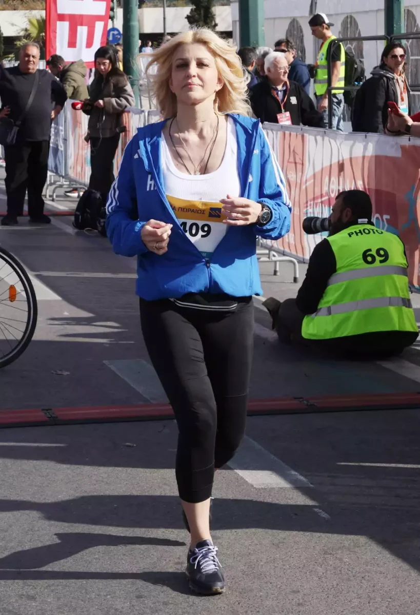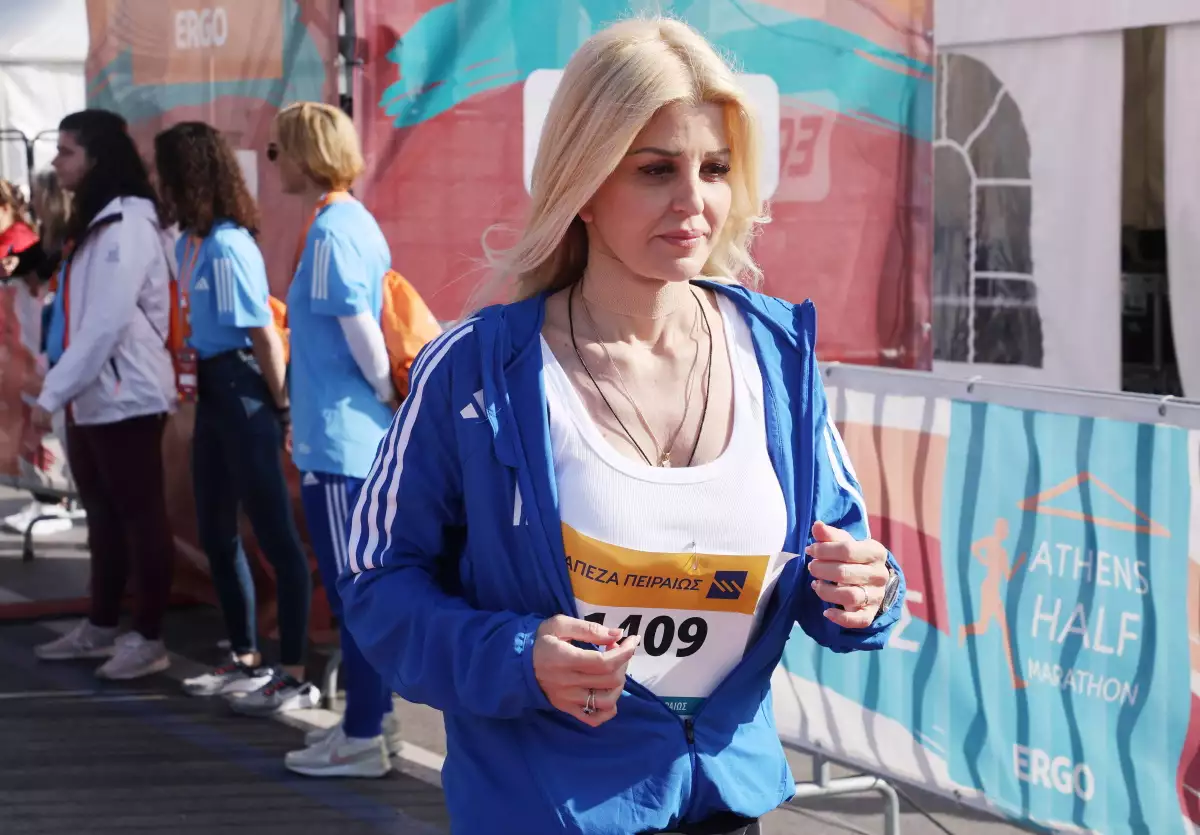 Φανερά ευδιάθετη, η Έλενα Ράπτη συμμετείχε στον αγώνα και μάλιστα συνομίλησε με πολίτες που κατέβηκαν στο κέντρο της Αθήνας για τον Ημιμαραθώνιο.