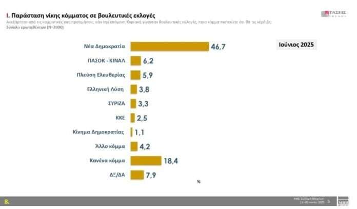 Πιο συγκεκριμένα, η Νέα Δημοκρατία μπορεί να διατηρεί την πρωτιά στην πρόθεση ψήφου με 23,7%, ωστόσο το ποσοστό αυτό δεν προκαλεί κανενός είδους ασφάλεια. Είναι εντυπωσιακά χαμηλό για κυβερνών κόμμα και ενδεικτικό μιας κυβέρνησης που έχει απομακρυνθεί από τον κοινωνικό παλμό, ενώ η φθορά είναι ήδη έντονη, παρά την απουσία ουσιαστικής αντιπολίτευσης.