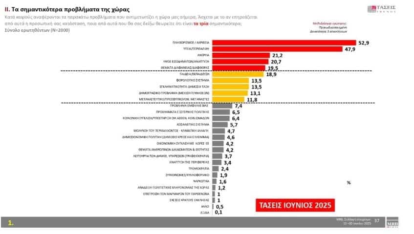 Τα προβλήματα που καίνε την κοινωνία είναι ξεκάθαρα. Πληθωρισμός/ακρίβεια (52,9%), προβλήματα στην υγεία (47,9%) και ανεργία (21,2%). Αλλά τα κόμματα αποτυγχάνουν να αρθρώσουν πειστικές προτάσεις.