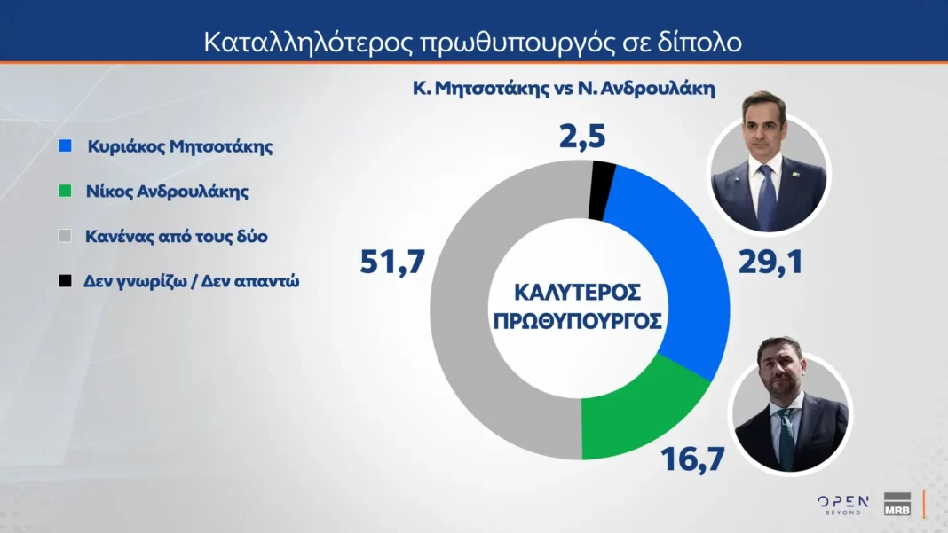 Η Νέα Δημοκρατία βρίσκεται συχνά με ποσοστά γύρω στο 20 %–25 % στην πρόθεση ψήφου, αλλά σε πτώση σε πολλές μετρήσεις.