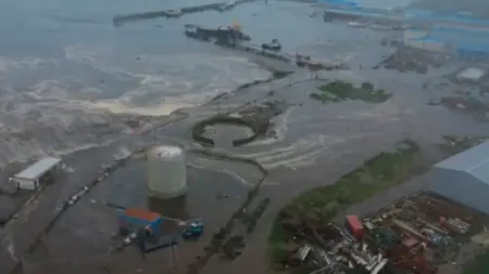 Βίντεο που μεταφορτώθηκαν σε ιστότοπους κοινωνικής δικτύωσης εικονίζουν ορμητικά νερά καθώς εισέβαλαν σε ακίνητα στην πόλη Σέβερο-Κουρίλσκ, ο πληθυσμός της οποίας απομακρύνθηκε εσπευσμένα.