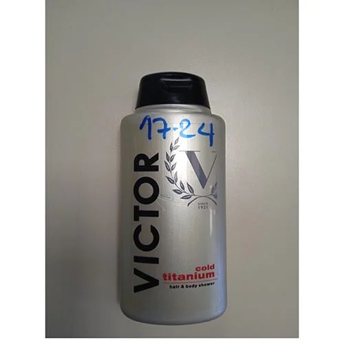 Πρόκειται για το σαμπουάν αφροντούς VICTOR cold titanium hair & body shower με αριθμό παρτίδας 826001 και Barcode 8009150800517 των 250 ml σε πλαστικό μπουκάλι σε ασημί χρώμα.
