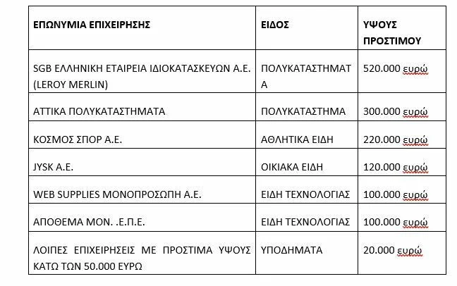 Σύμφωνα με τις διατάξεις του άρθρου 13α του ν. 2251/1994, περί ανακοίνωσης των επωνυμιών των επιχειρήσεων στις οποίες επιβλήθηκε πρόστιμο ύψους μεγαλύτερου από 50.000 ευρώ επιβλήθηκαν τα ακόλουθα πρόστιμα: