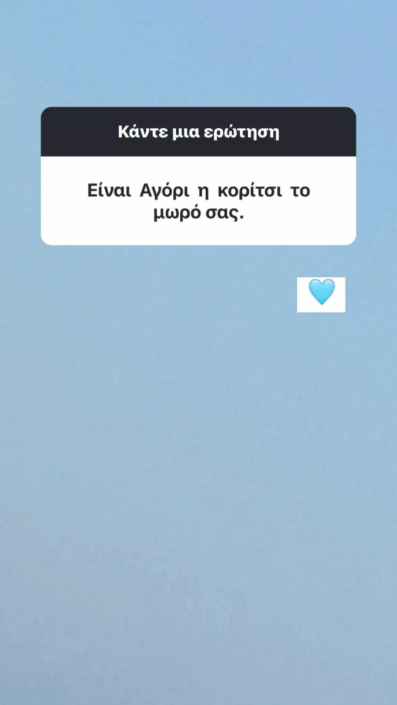 Πιο συγκεκριμένα, όταν διαδικτυακός της φίλος τη ρώτησε αν είναι κορίτσι ή αγόρι, η Ευρυδίκη Παπαδοπούλου απάντησε με μία γαλάζια καρδούλα που μαρτυρά ότι περιμένει αγοράκι.