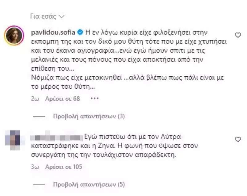 «Η εν λόγω κυρία είχε φιλοξενήσει στην εκπομπή της και τον δικό μου θύτη τότε που με είχε χτυπήσει και του έκανε αγιογραφία…ενώ εγώ ήμουν σπίτι με τις μελανιές και τους πόνους που είχα αποκτήσει από την επίθεση του… Νόμιζα πως είχε μετακινηθεί …αλλά βλέπω πως πάλι είναι με το μέρος του θύτη…», έγραψε κάτω από την ανάρτηση η Σοφία Παυλίδου, αναφερόμενη στη στάση που είχε κρατήσει η δημοσιογράφος στη δική της υπόθεση.