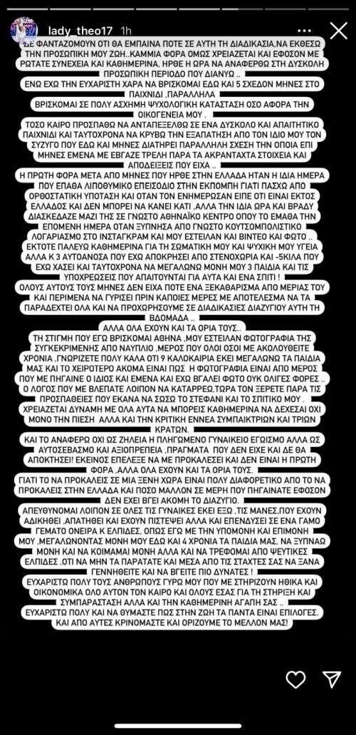 Ευχαριστώ πολύ τους ανθρώπους γύρω μου που με στηρίζουν ηθικά και οικονομικά όλον αυτό τον καιρό και όλους εσάς για την στήριξη και συμπαράσταση αλλά και την καθημερινή αγάπη. Σας ευχαριστώ πολύ και να θυμάστε πως στη ζωή τα πάντα είναι επιλογές. Και από αυτές κρινόμαστε και ορίζουμε το μέλλον μας», έγραψε η Ζέτα Θεοδωροπούλου στο μακροσκελές στόρι της.