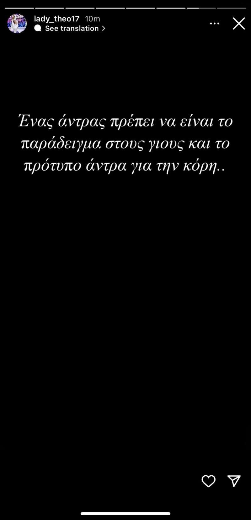 Συμπλήρωσε μάλιστα σε άλλα δύο stories τα παρακάτω: «Ένας άντρας πρέπει να είναι το παράδειγμα στους γιους και το πρότυπο άντρα για την κόρη… ντράπηκε και η ντροπή»