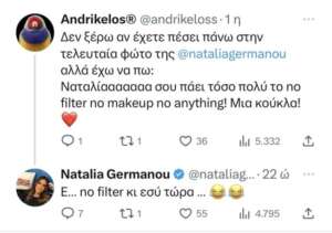 Το εν λόγω tweet δεν έμεινε αναπάντητο από τη Ναταλία Γερμανού. “Ε… no filter κι εσύ τώρα…” σχολίασε χαριτολογώντας η δημοφιλής παρουσιάστρια ενώ πρόσθεσε μια φατσούλα που κλαίει από τα γέλια.