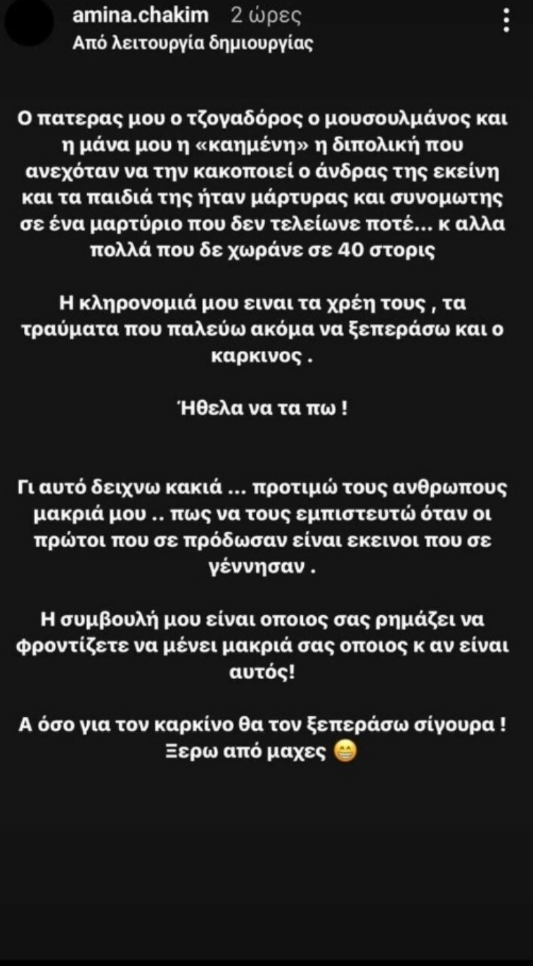 Γι’ αυτό δείχνω κακιά… προτιμώ τους ανθρώπους μακριά μου…πως να τους εμπιστευτώ όταν οι πρώτοι που σε πρόδωσαν είναι εκείνοι που σε γέννησαν. Η συμβουλή μου είναι όποιος σας ρημάζει να φροντίζετε να μένει μακριά σας όποιος κι αν είναι αυτός! Α όσο για τον καρκίνο θα τον ξεπεράσω σίγουρα. Ξέρω από μάχες», έγραψε η Αμίνα Χακίμ.