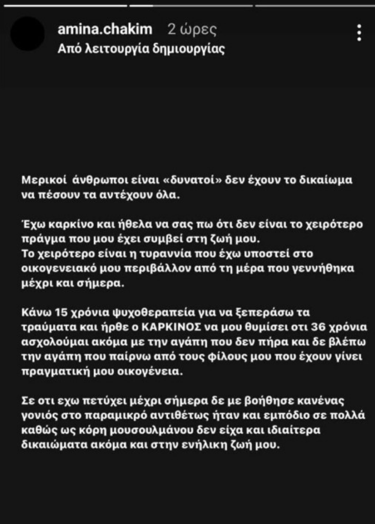 Συγκεκριμένα, η Αμίνα Χακίμ αποκάλυψε μέσα από μία μακροσκελή ανάρτηση πως το τελευταίο διάστημα δίνει τη δική της μάχη με τον καρκίνο, ενώ μίλησε και για άγνωστες πτυχές της προσωπικής της ζωής, αναφερόμενη στις δύσκολες καταστάσεις που βίωσε μέσα στο οικογενειακό περιβάλλον.