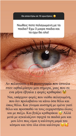 «Αν πελαγώνω; Η φωτογραφία που έστειλα στον οφθαλμίατρό μου σήμερα, μιας που σε ένα μήνα έβγαλα 2 φορές κριθαράκι. Ναι, υπάρχουν φορές που νιώθω πελαγωμένη, που δε προλαβαίνω να κάνω όλα όσα θέλω και όπως τα θέλω. Και γίνομαι αυστηρή με εμένα γιατί θέλω και προσπαθώ να τους ευχαριστήσω όλους και με πιέζω. Και βγάζω κριθαράκια», εξομολογήθηκε η Δούκισσα Νομικού δείχνοντας μια φωτογραφία από το μάτι της.