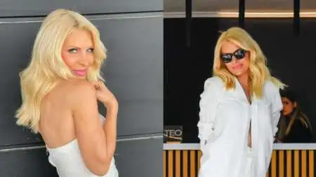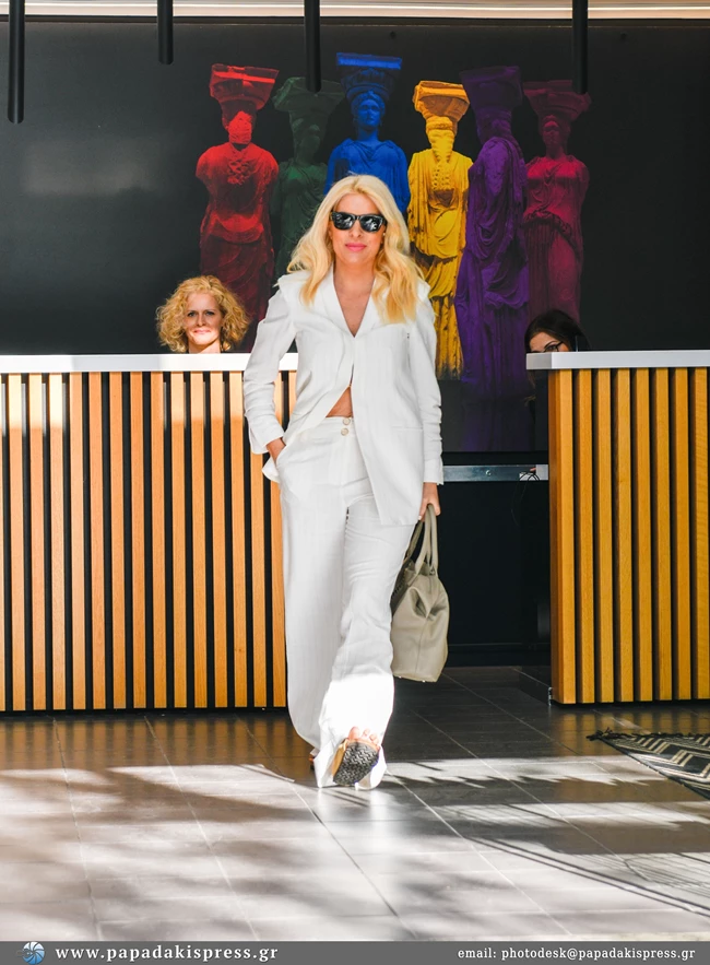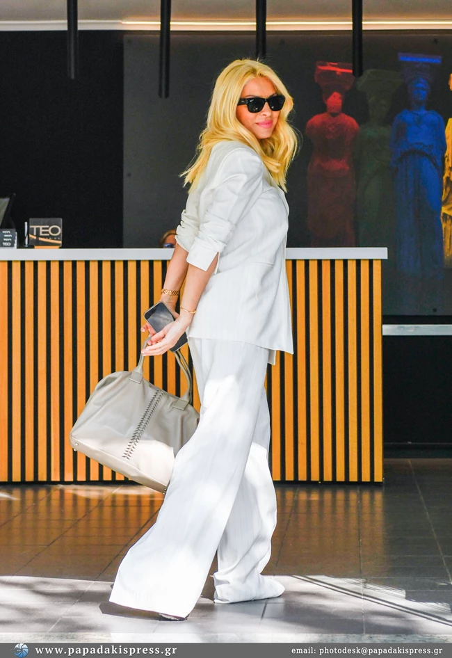 Η αγαπημένη παρουσιάστρια για την εξόρμησή της, επέλεξε ένα λευκό λινό κοστούμι που συνδύασε με σανδάλια και μία oversized μπεζ δερμάτινη τσάντα. Είχε αφήσει μισάνοιχτο το σακάκι του συνόλου της, γεγονός που έκανε την εμφάνισή της να μοιάζει ακόμα πιο καλοκαιρινή. Τα ξανθά μαλλιά της ήταν σε ελαφριές μπούκλες ενώ το μακιγιάζ της, διακριτικό, έδινε έμφαση στα καλοσχηματισμένα χείλη της, με ένα pink nude κραγιόν.