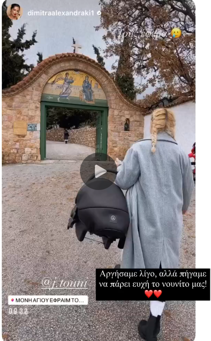 Μαζί τους ήταν και η Δήμητρα Αλεξανδράκη, η οποία δημοσίευσε ένα σχετικό βίντεο έξω από το μοναστήρι στον προσωπικό της λογαριασμό στο Instagram